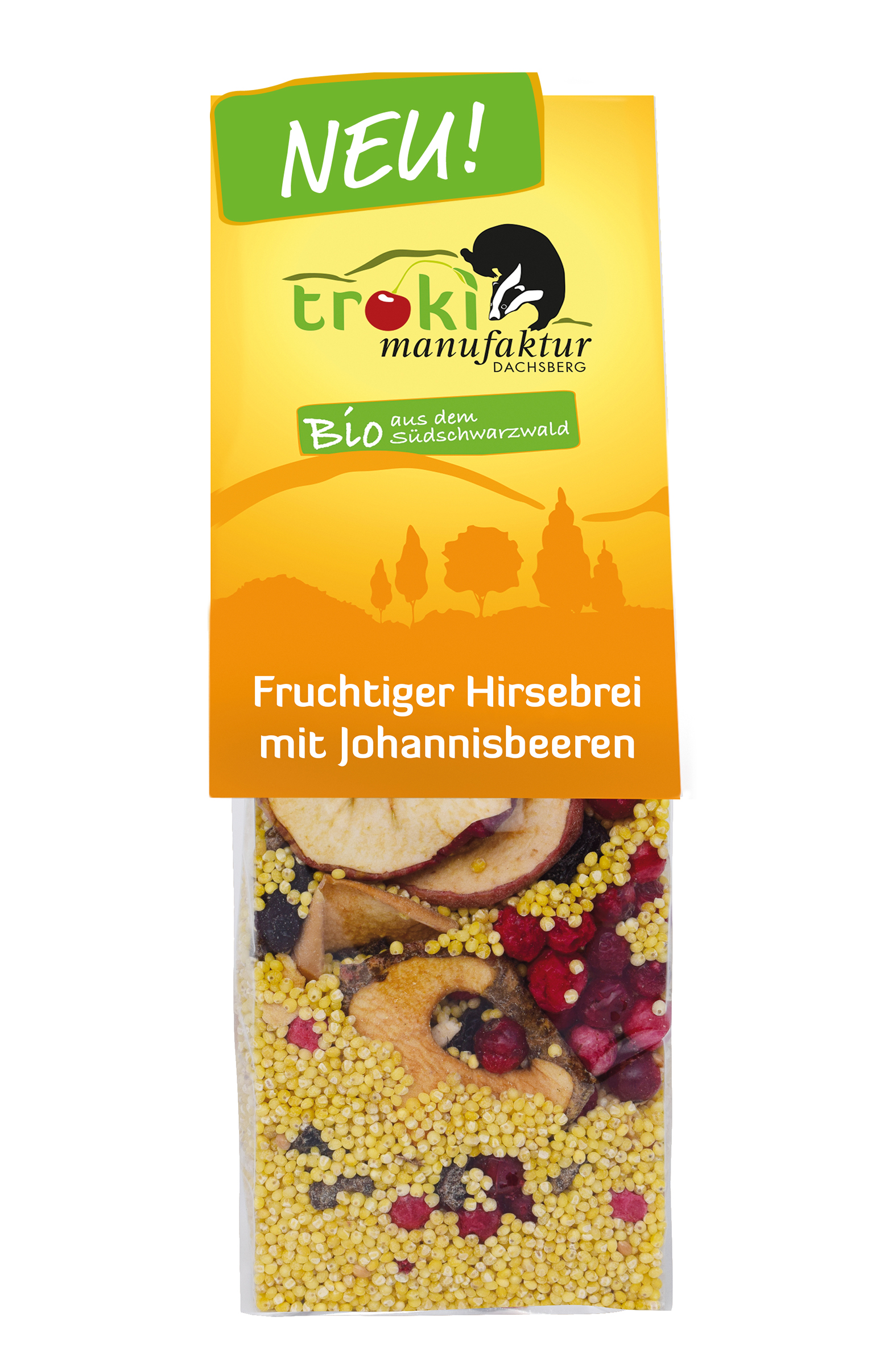 Zutaten: Goldhirse*(88% Herkunft DE / A), Sauerkirschen*, Zwetschgen*, Äpfel*, Johannisbeeren* (2%), (gesamt Fruchtanteil 12%). *kontrolliert biologische Erzeugung – 250g.